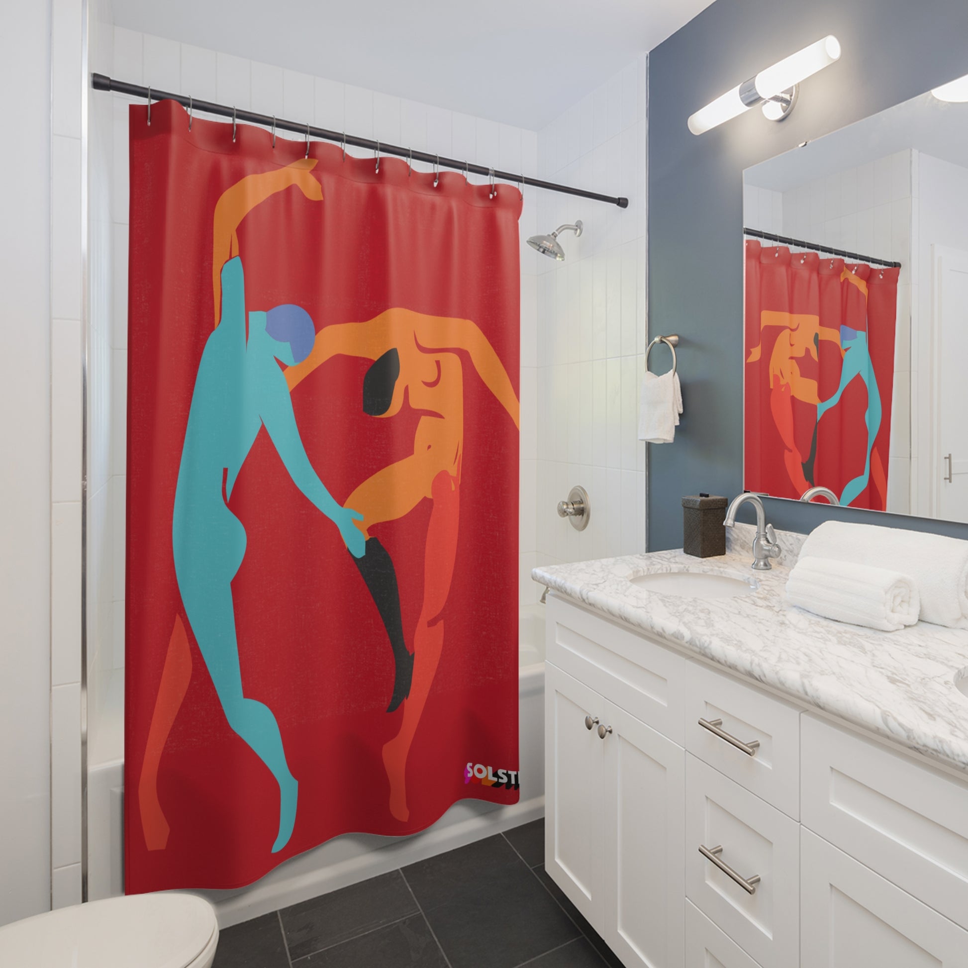 This SOLSTICE shower curtain is here to add an original touch style to any bathroom with your designs. Inspired in the Matisse Solstice Dance, was designed by AFANADOR. Made with highly durable polyester, this curtain stays like new for a long time to come and is a perfect printing area for your art. Please note: While polyester offers adequate protection against water, a liner might be necessary for full waterproofness.